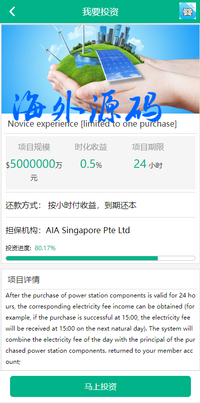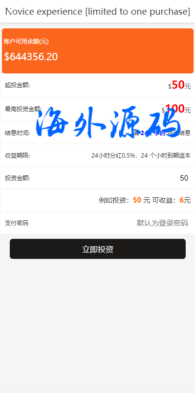 分红模式: 1、每小时返息,到期还本 2、每日返息,到期还本 3、每周返息,到期还本 4、每月返息,到期还本 5、每日得利,保本保息 6、到期还本还息