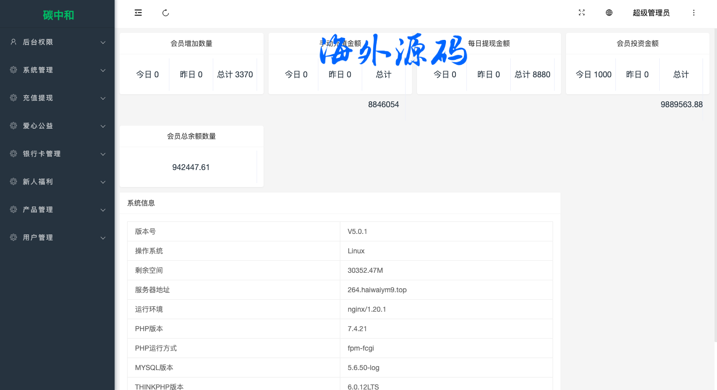 系统功能完善带代理后台,功能有签到,余额宝,爱心捐赠,邀请,转账等功能