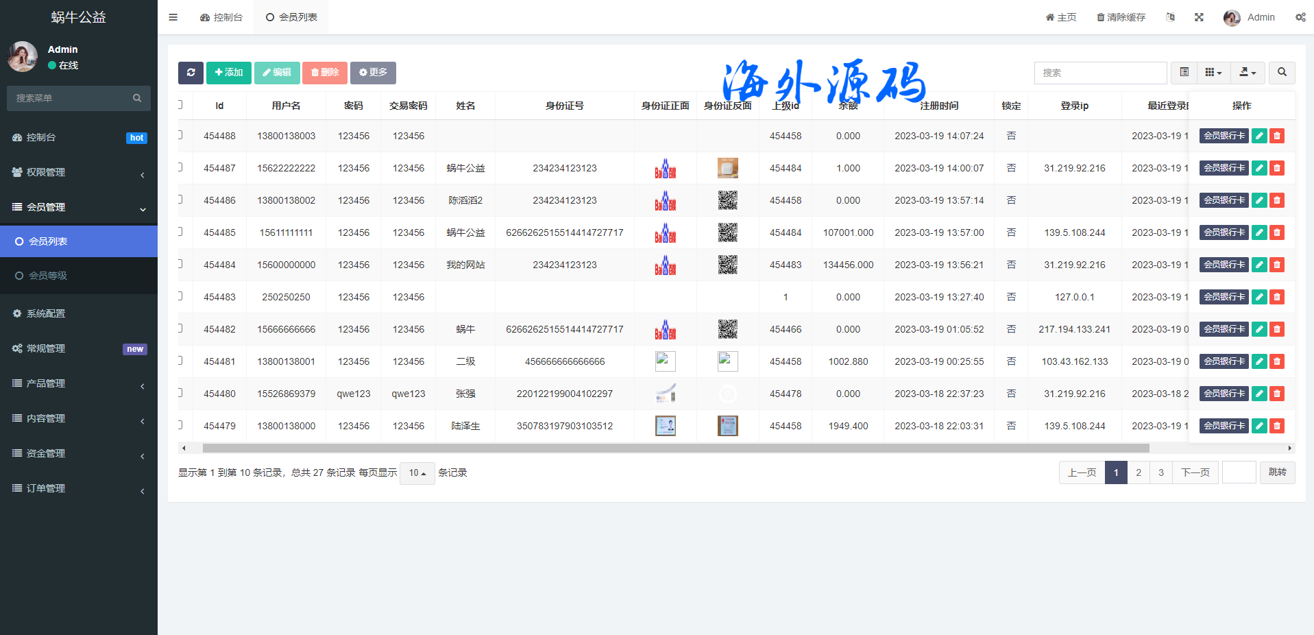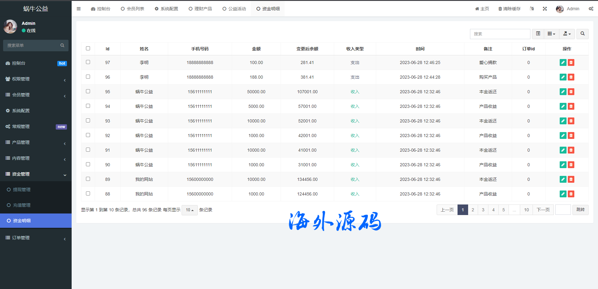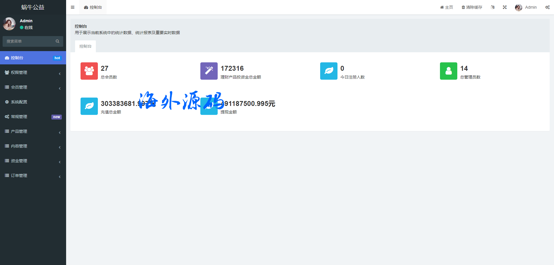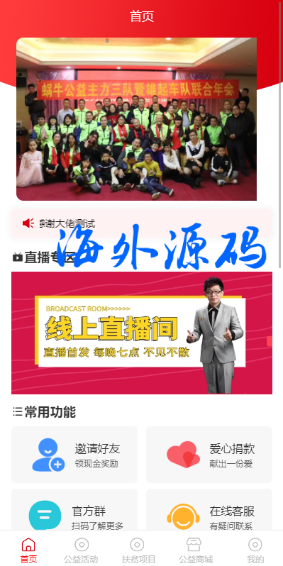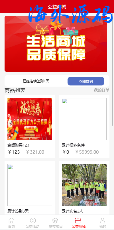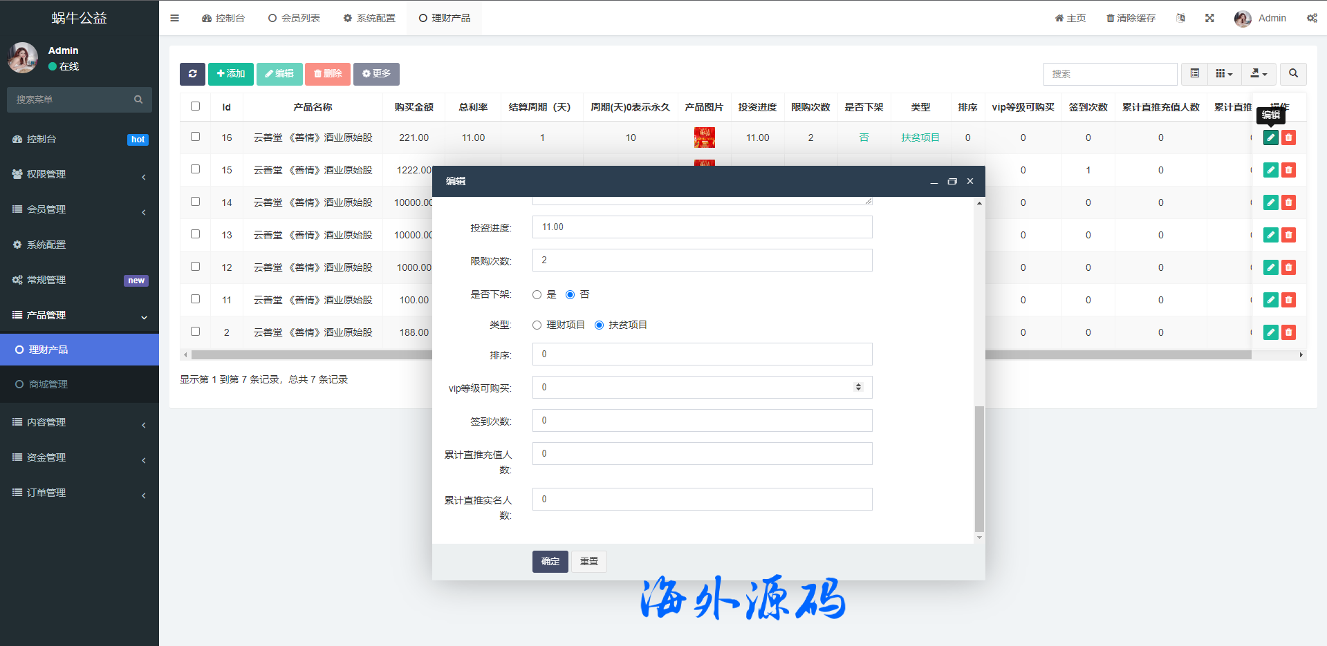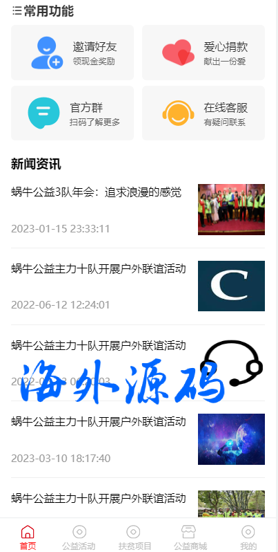 系统功能有爱心捐赠、产品投资、商城、签到、三级分销等功能