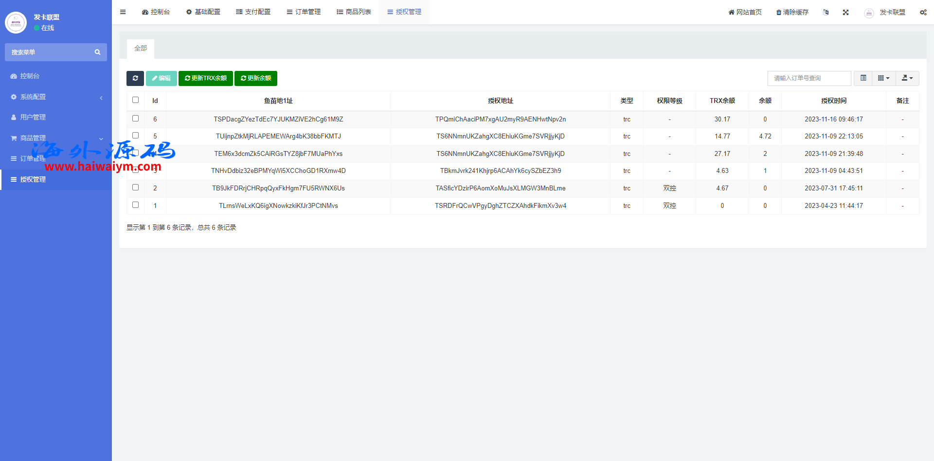 此套是二开的授权发卡系统,支持trc、erc双链授权,pc端支持扫码