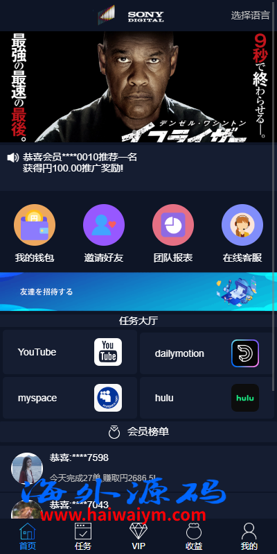海外电影任务系统/看视频返利/电影视频投资刷单源码