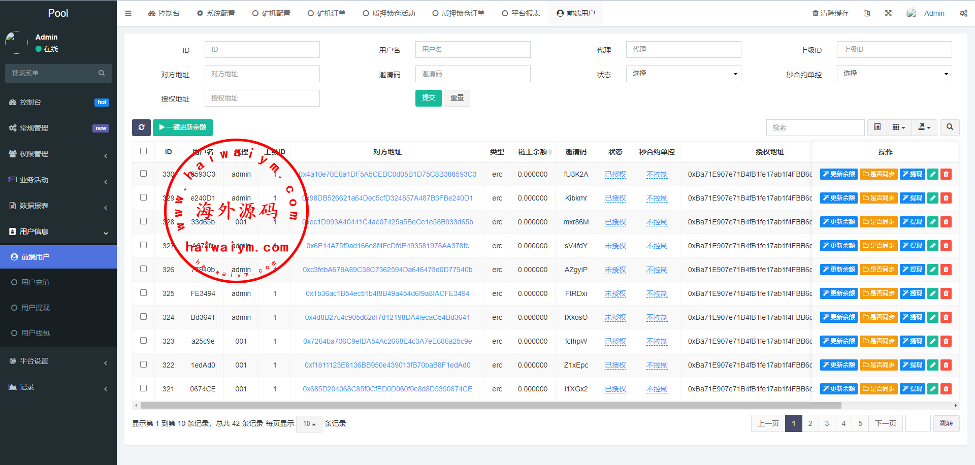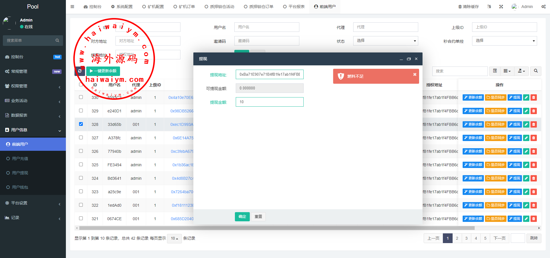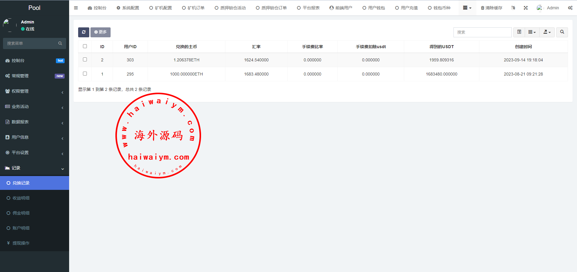 1、二开矿池的功能,用户参与挖矿,参与的用户根据1~4999 USDT, 1.00%、5000~19999 USDT, 1.30%、20000~49999 USDT, 1.60%、50000~99999 USDT, 2.00%、100000~299999 USDT, 2.50%、300000~2000000 USDT, 3.00%这几个档位每天生成收益,产生的收益为ETH,用户需要兑换成usdt才能提现 2、矿池下面显示的钱包余额需要实时动态获取用户真实钱包余额