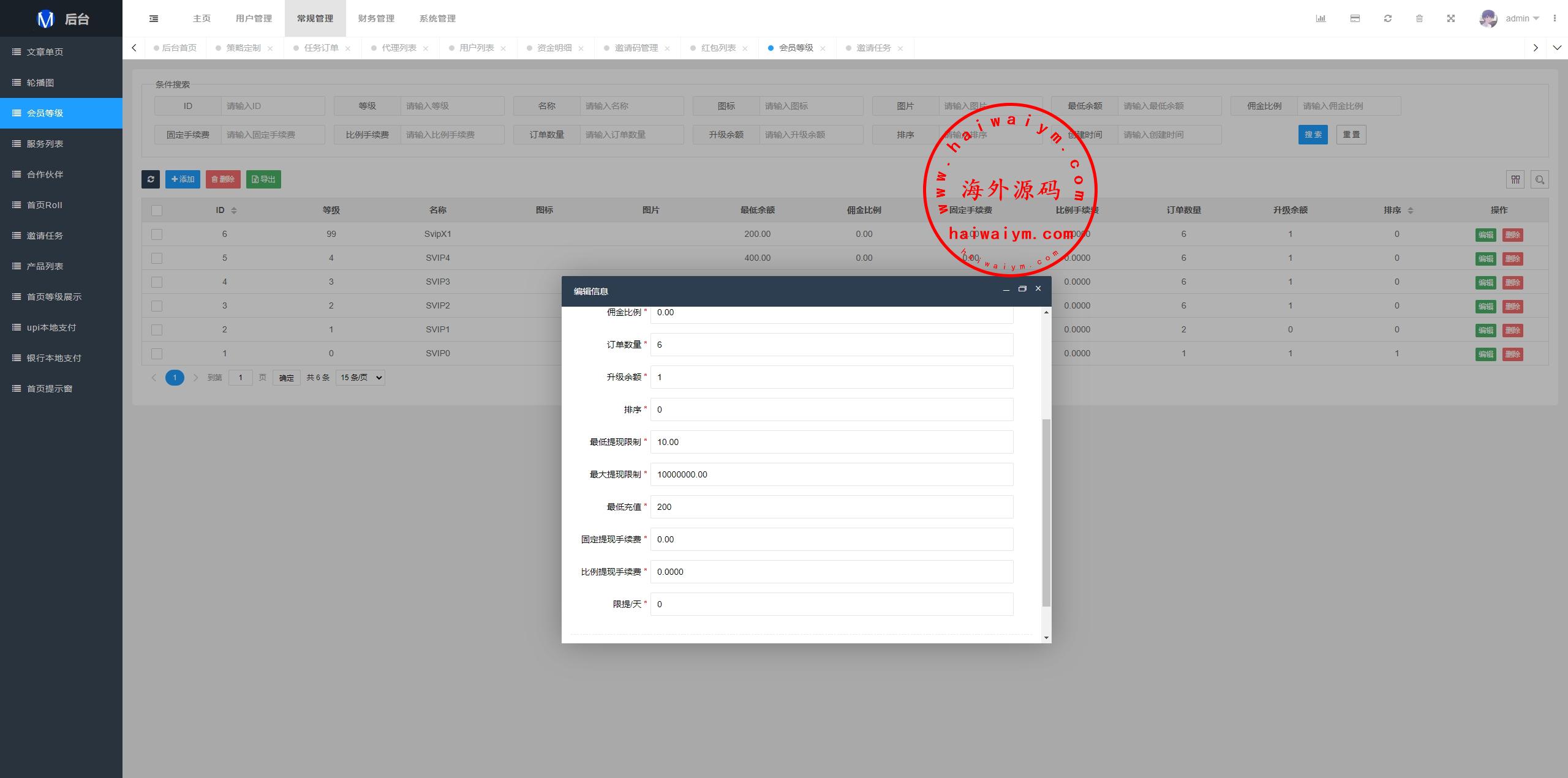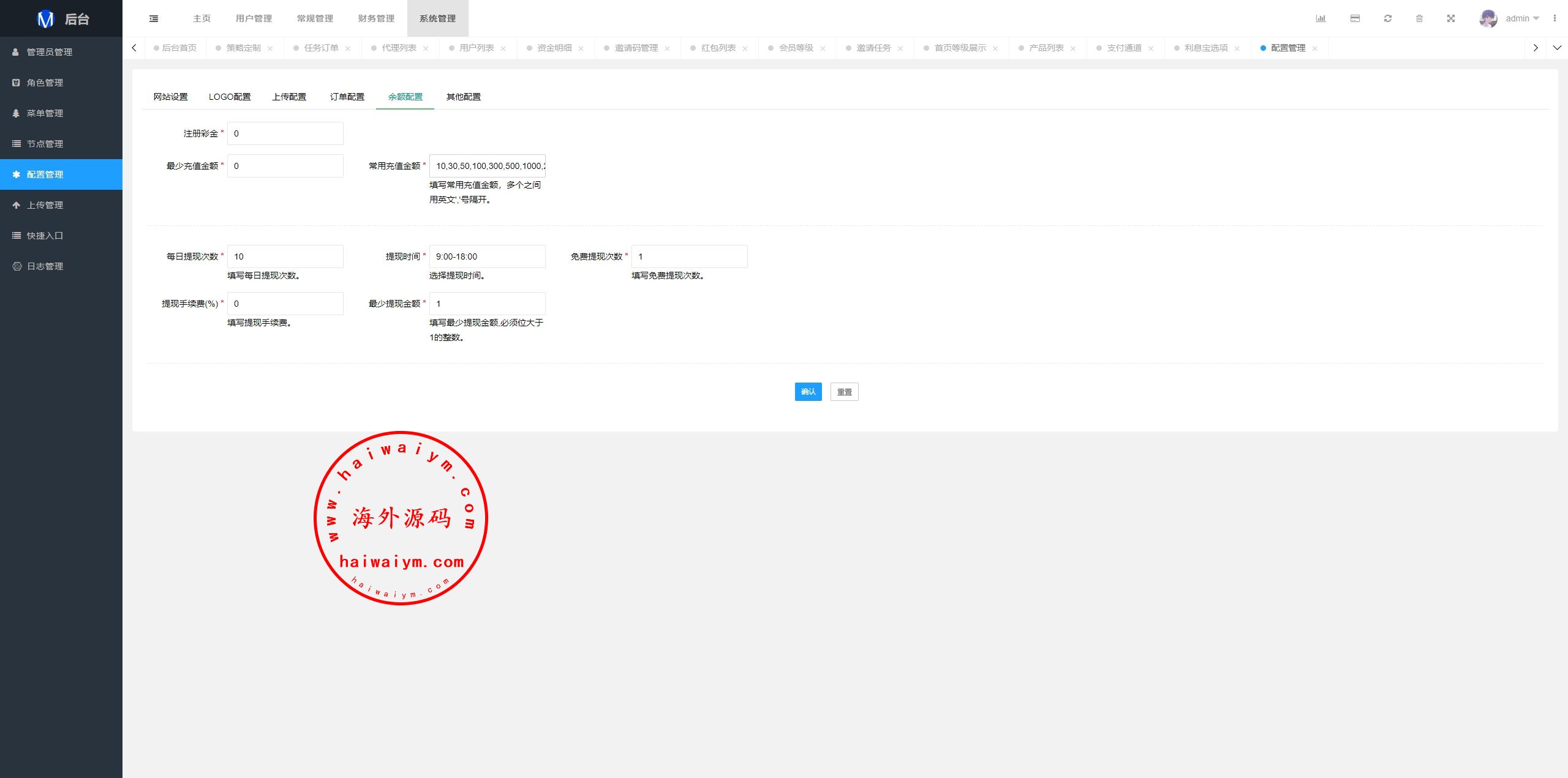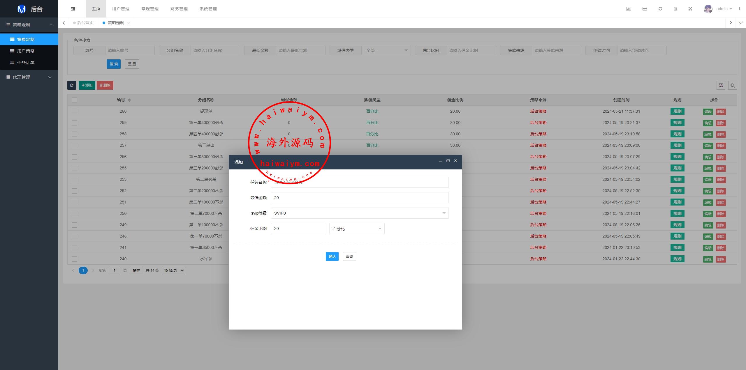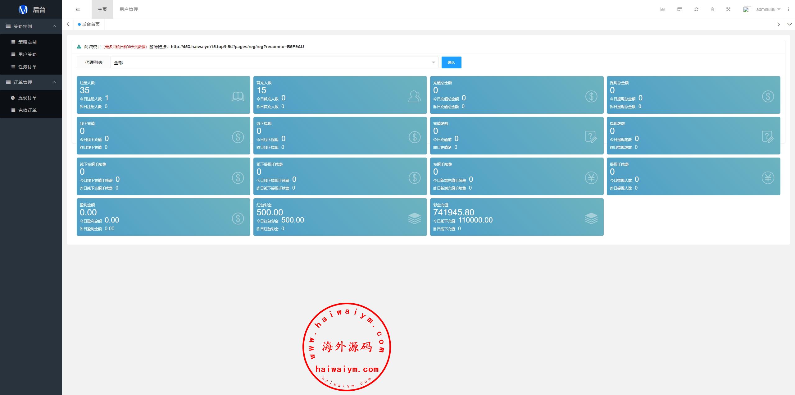 系统支持策略配置,后台共享代理后台独立,系统基本符合市场需求,单独的代理后台等功能