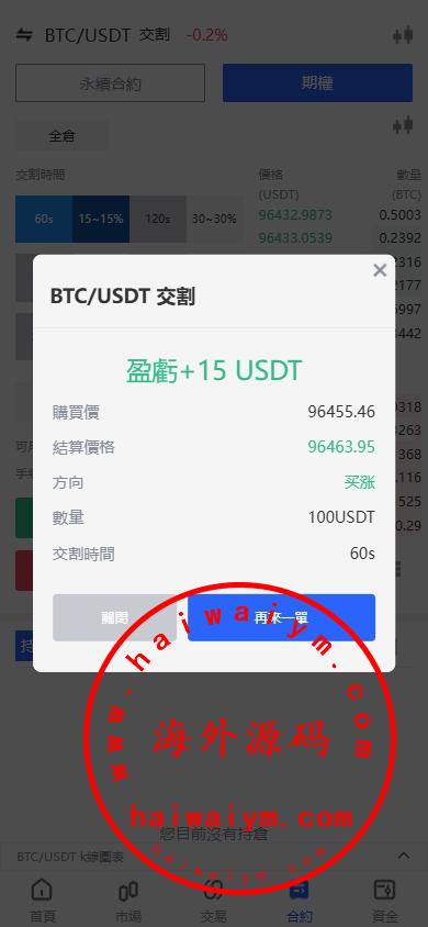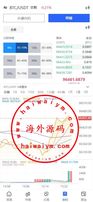 系统功能:币币交易、永续合约、期权交易、闪兑、理财、借币、邀请等功能