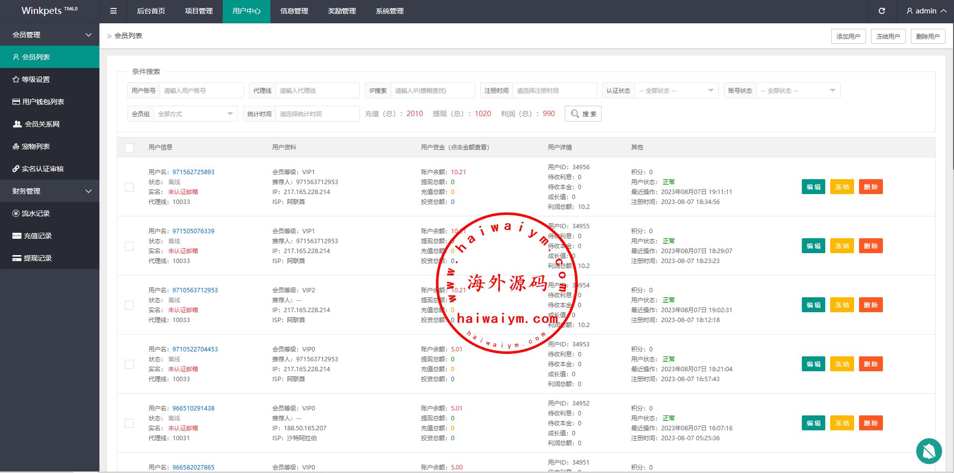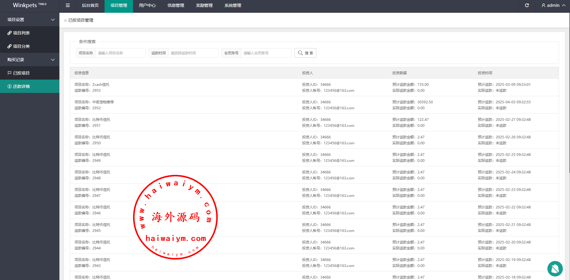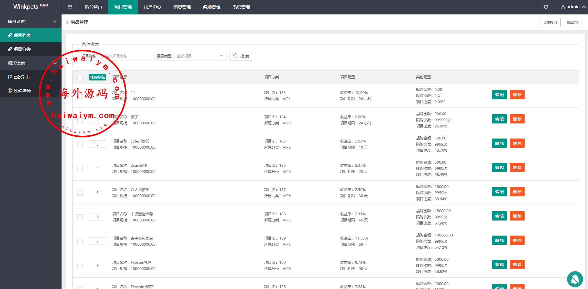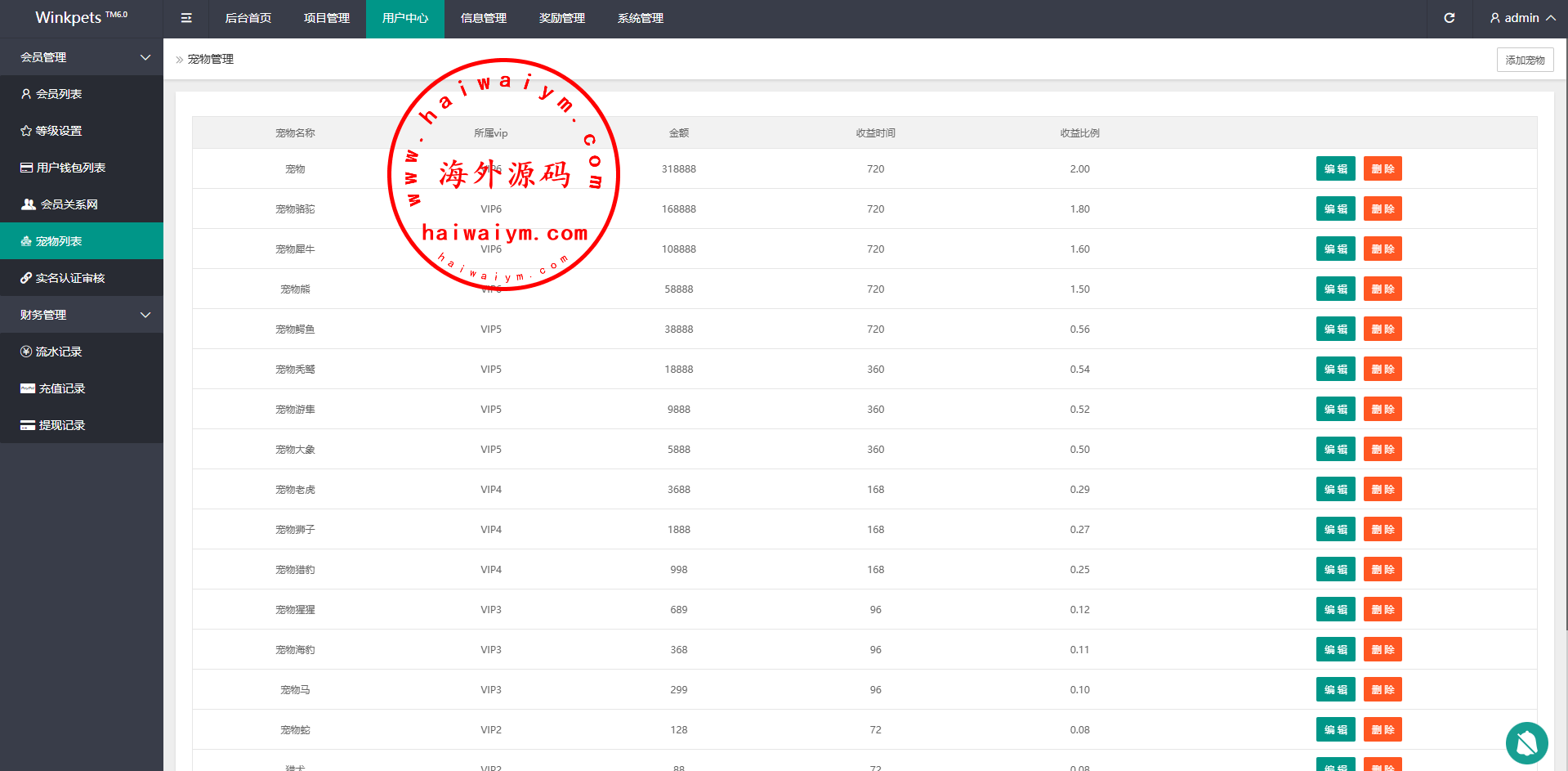 系统功能支持单独项目投资,会员等级对应级别宠物领养投资