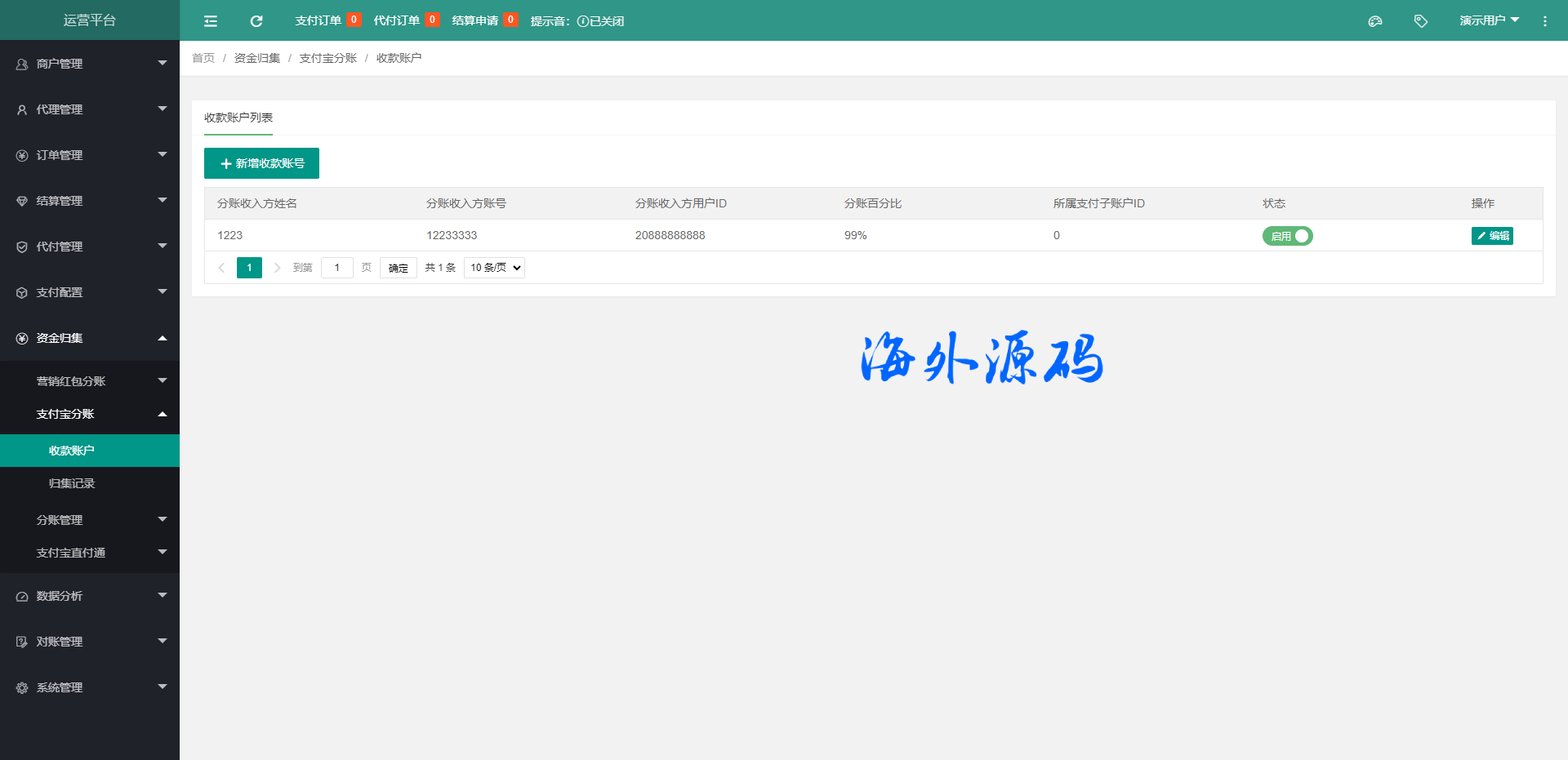 支付系统包括:运营后台,代理商后台,商家后台。