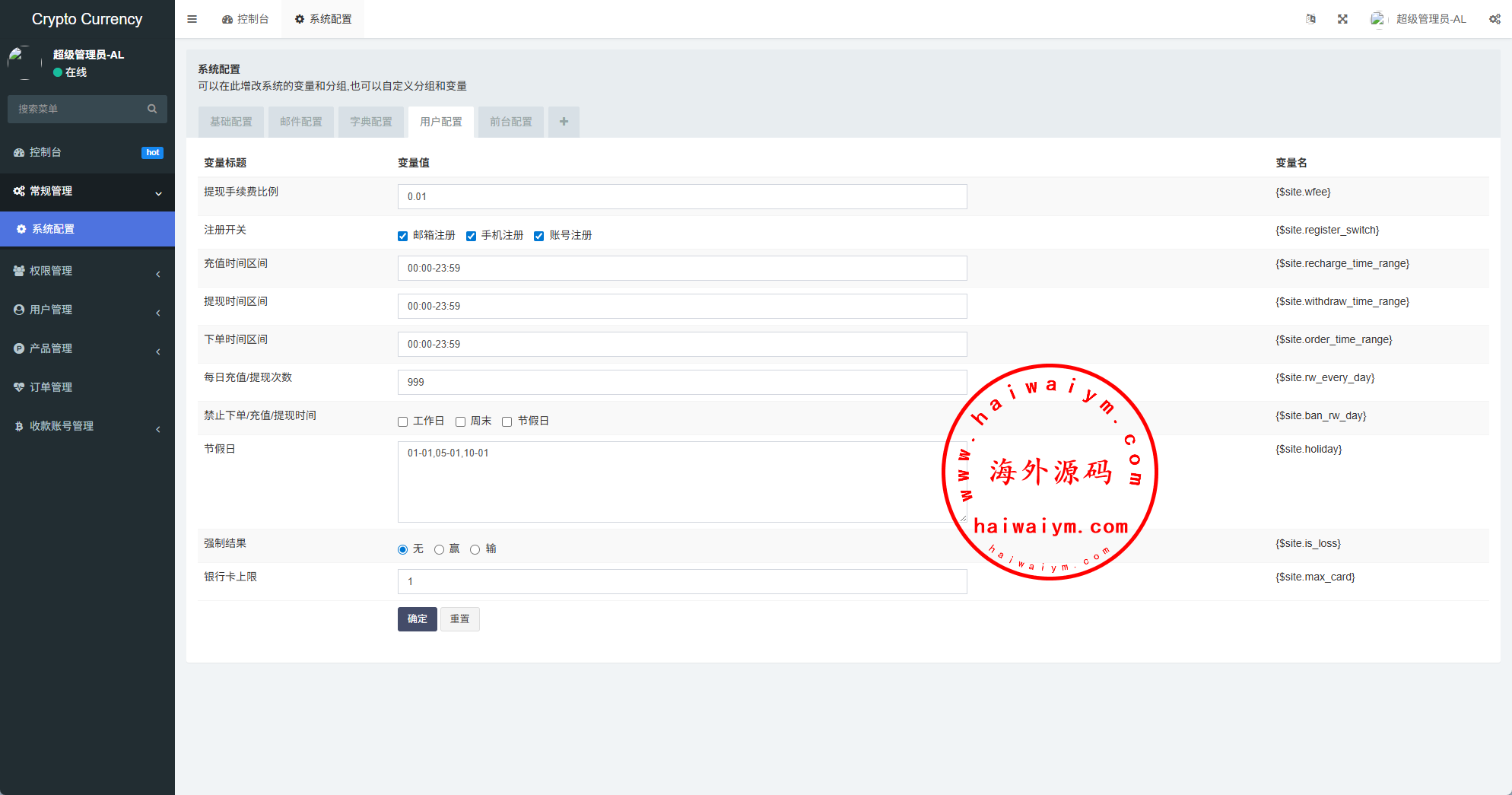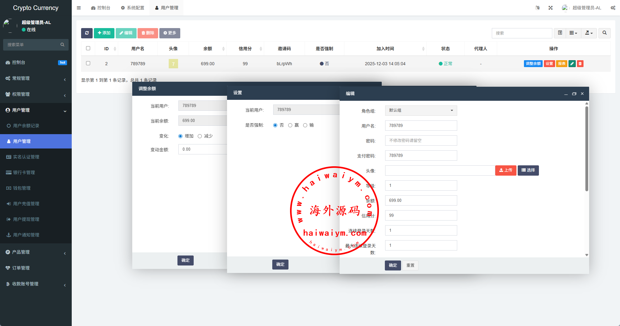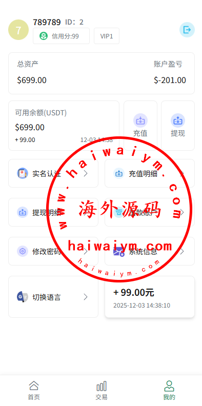 系统功能:信用分,实名认证,银行卡usdt充值提现,用户单控,订单控制等功能
