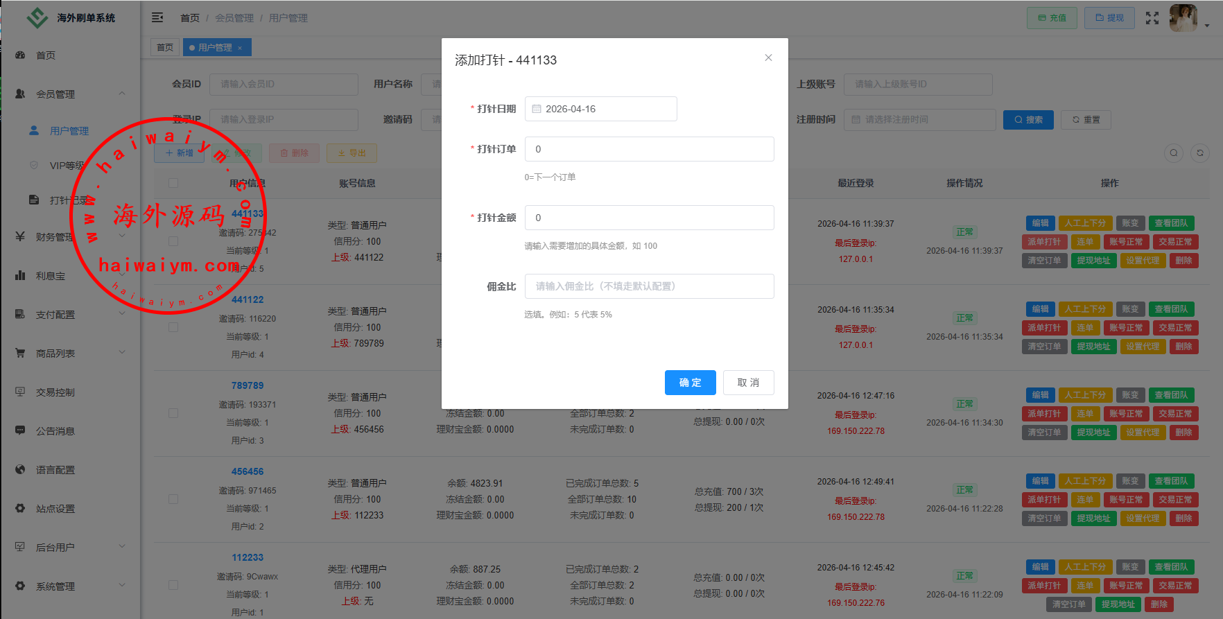 功能:金额打针,连单,信用分,重置订单,时区设置,余额宝,代理等诸多功能此套系统全开源功能可定制二开,源码不便宜嘴炮勿扰